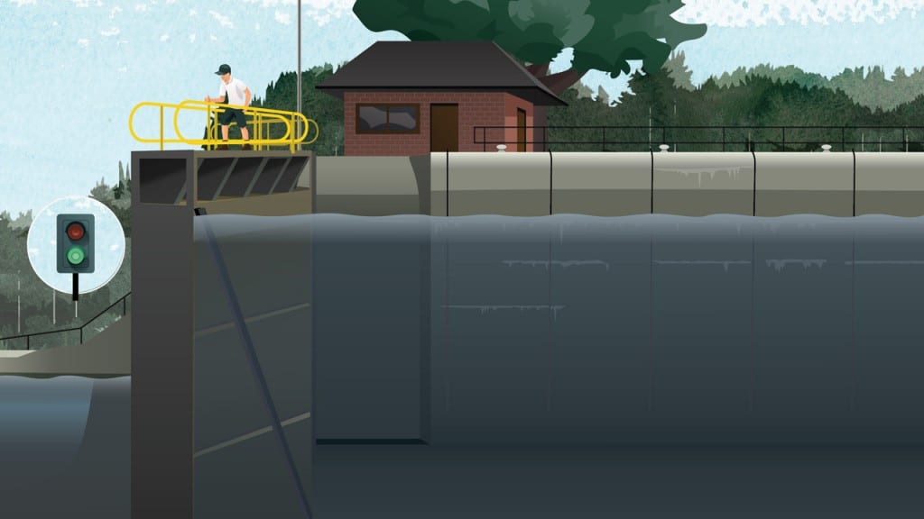 Fenders and mooring lines, a minimum of 75 feet in length, should be kept ready upon entering the lock. Once inside, the lock lines are adjusted with the water level.