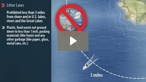 Federal law prohibits the release of waste matter of any kind into U.S. waters—this includes trash, garbage, oil and other liquid pollutants. The rules are the same for all boat types and depend on how far your boat is from shore: